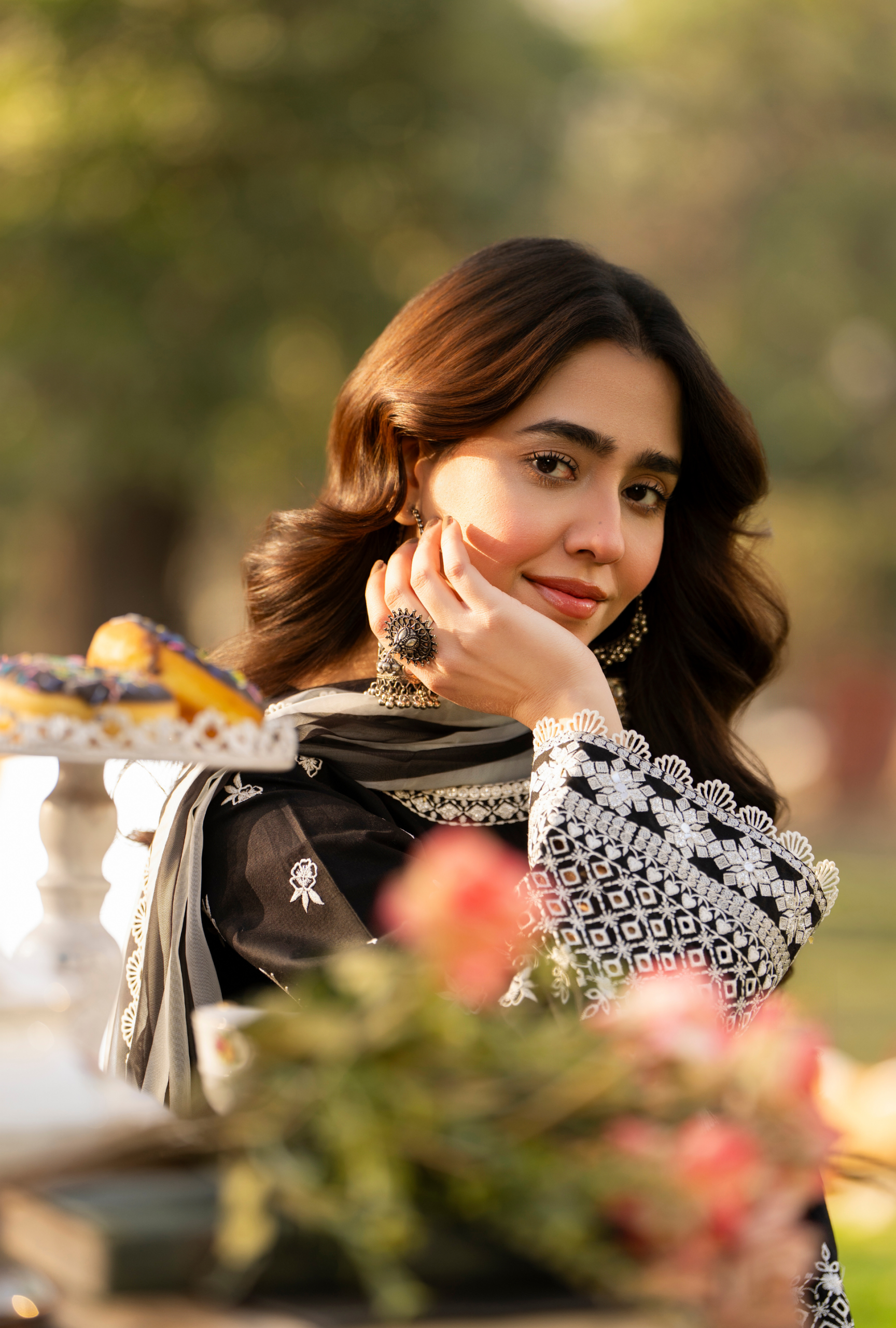 Organza Flowers and Chikankari Sleeves - Dupatta:Printed Chiffon Dupatta with all around Lace